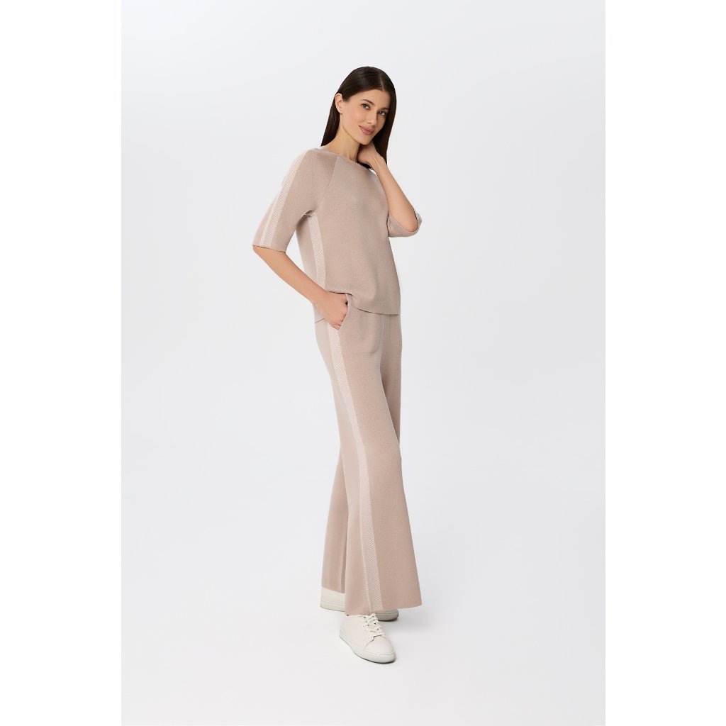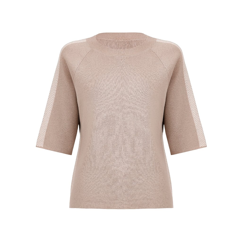 A cashmere sweater with a round neckline and cropped sleeves — an elegant piece in a luxurious shade of elite taupe. The sleeves and side panels are decorated with a contrasting "herringbone" patterned insert, visually creating a slimmer silhouette. A stylish foundation for the everyday wardrobe, where simplicity meets the nobility of materials and precise geometric tailoring. ETERNAL WAVES — a collection dedicated to timeless elegance.