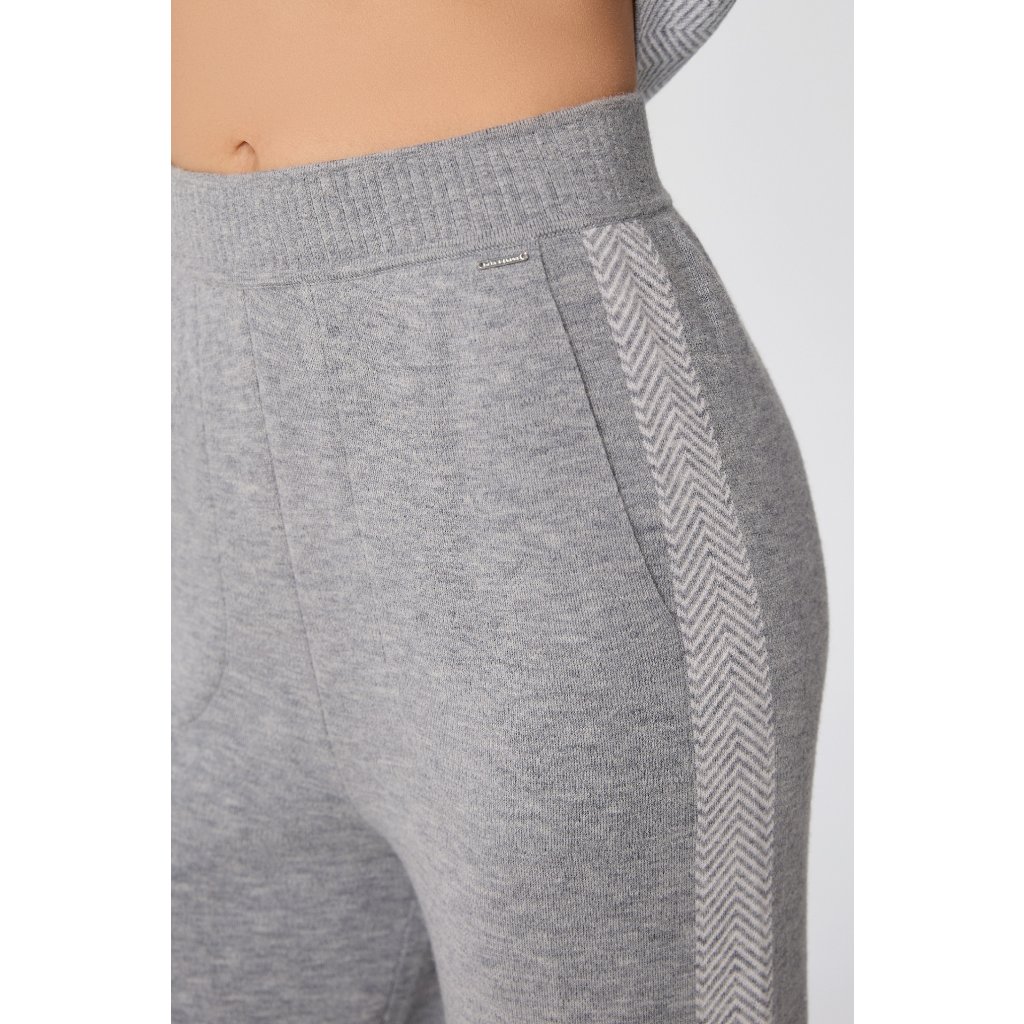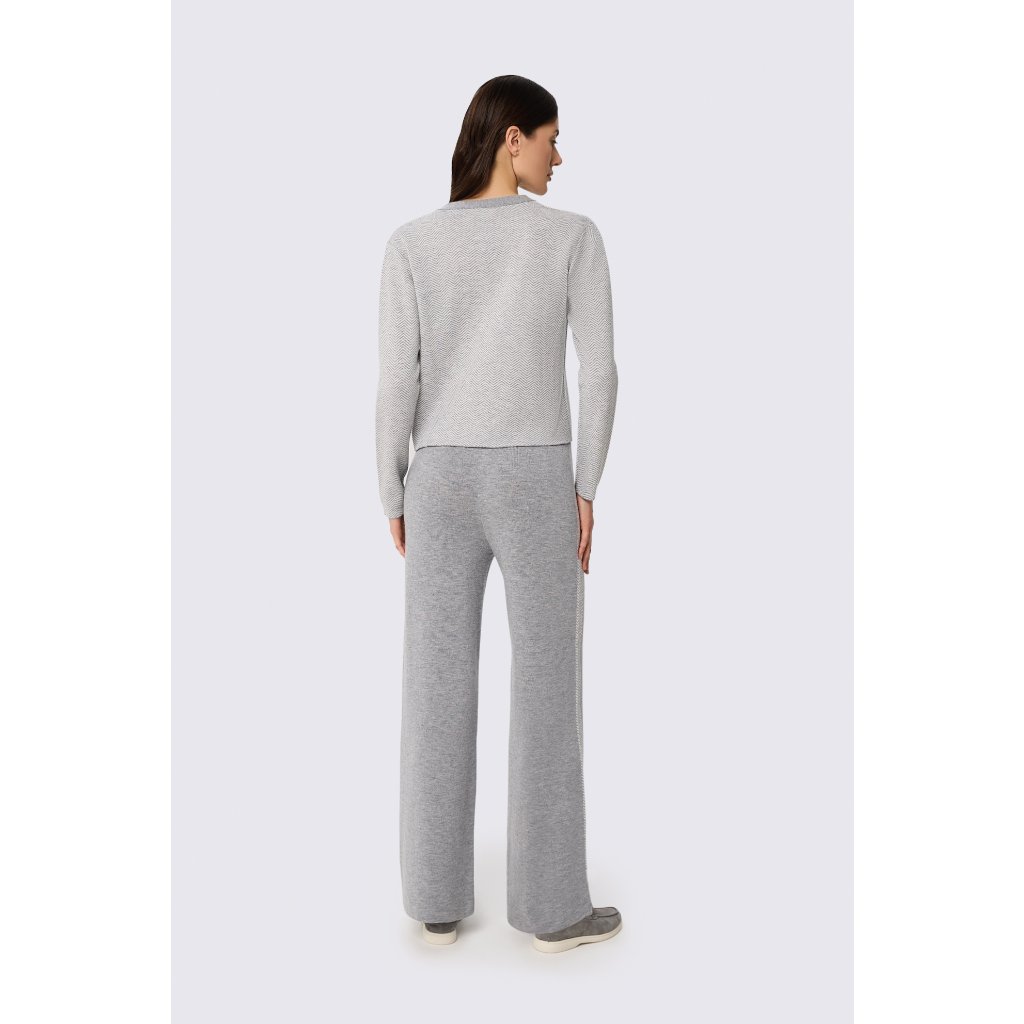 Měkké kašmírové kalhoty – dokonalá rovnováha mezi volným střihem a propracovanými detaily. Pohodlný pletený pružný pas zajišťuje snadné nošení a umožňuje oděvu se přizpůsobit pohybu. Volná silueta dodává pocit lehkosti, zatímco boční kapsy dodávají praktičnost. Pruhy se vzorem „rybí kosti“ opticky prodlužují linii nohavic a vytvářejí štíhlejší a elegantnější siluetu. ETERNAL WAVES – kolekce věnovaná nadčasové eleganci.