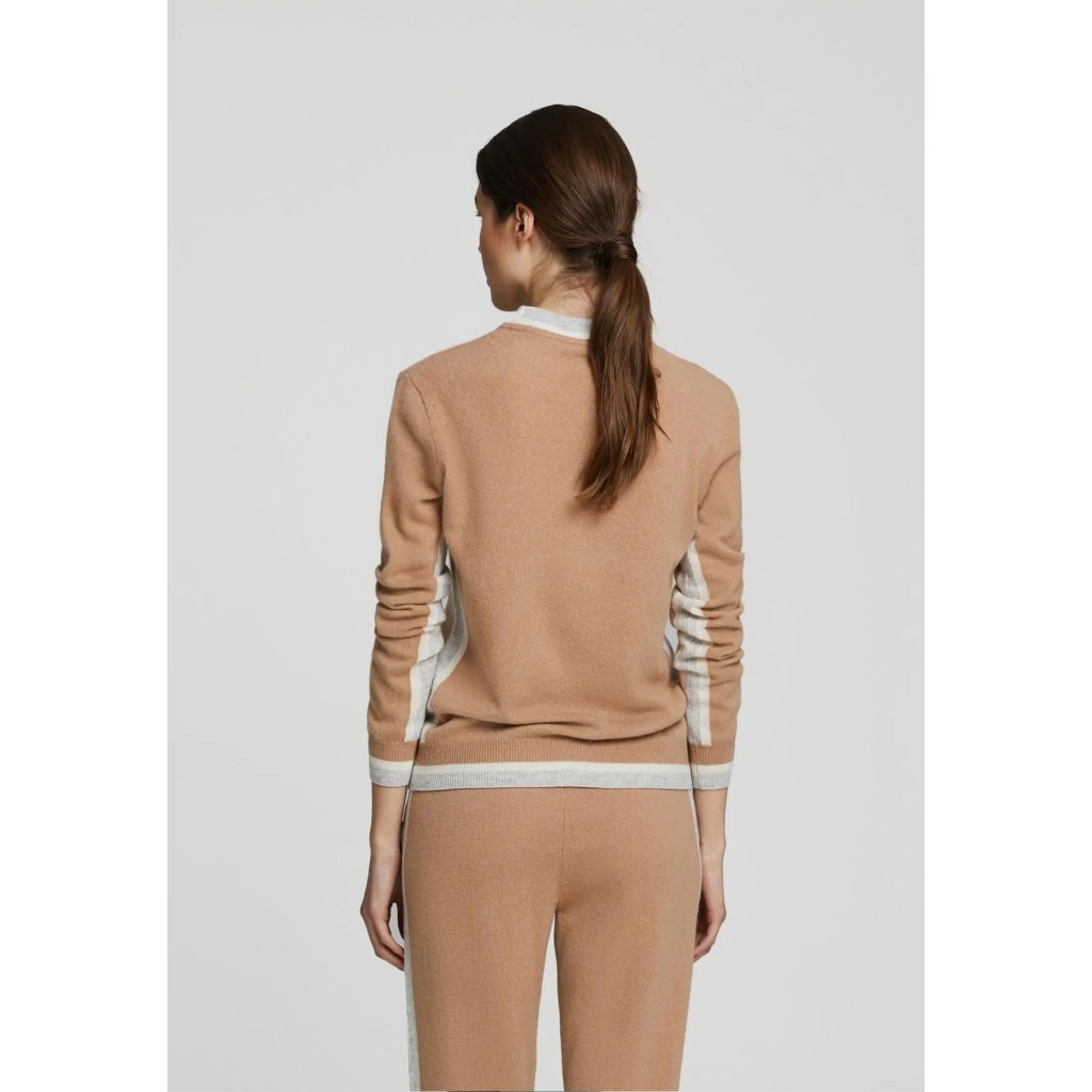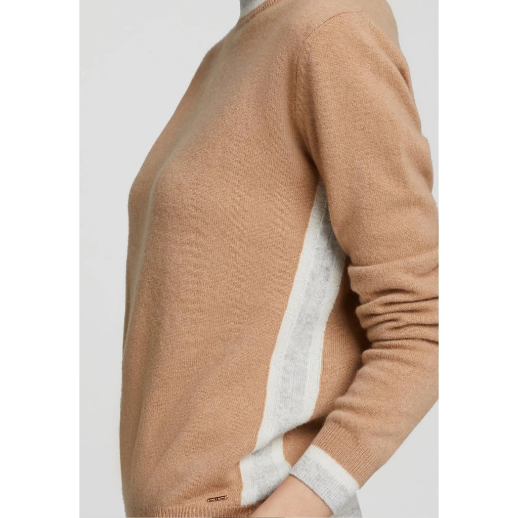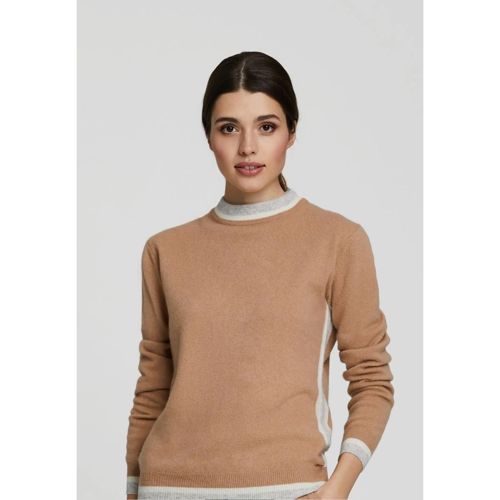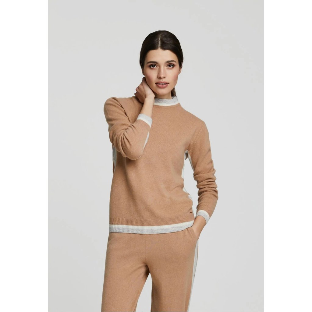 Dámský kašmírový rolák v syté a plné velbloudí béžové. Maličko ležérní, příjemně elegantní vzhled, ozvláštněno detaily a pruhem, který zdůrazňuje sofistikovanost a eleganci kašmíru a podtrhuje siluetu. Tato béžová je spíše teplejší barva, ale pokud zkombinujete se světle šedou, celkový dojem bude velmi elegantní. Velmi světlá šedá je například mikina ze stejné kolekce : Pokud na tento kašmírový svetr obléknete mikinu na zip, budete velmi chique a trendy. Šedé proužky a béžové proužky se na obou modelech zajímavě propojí. A hlavně v maximálním pohodlí.