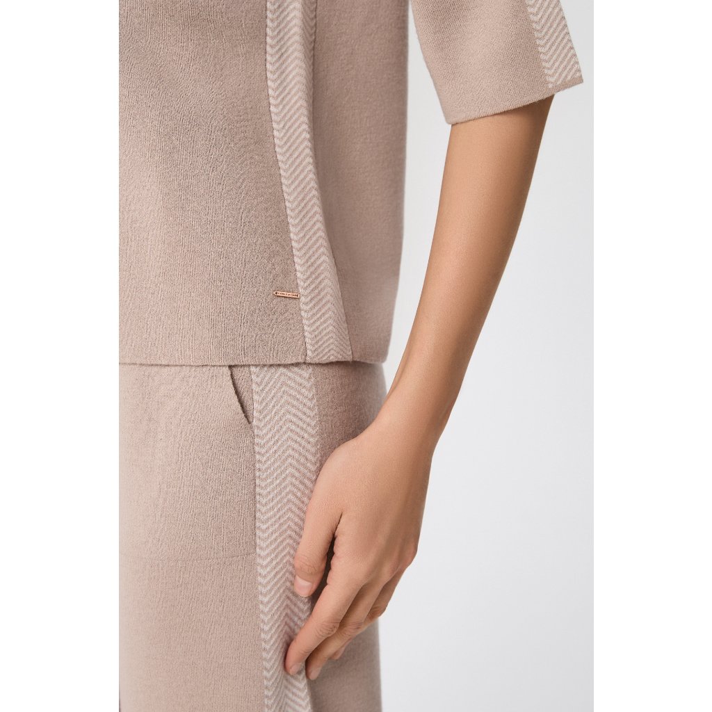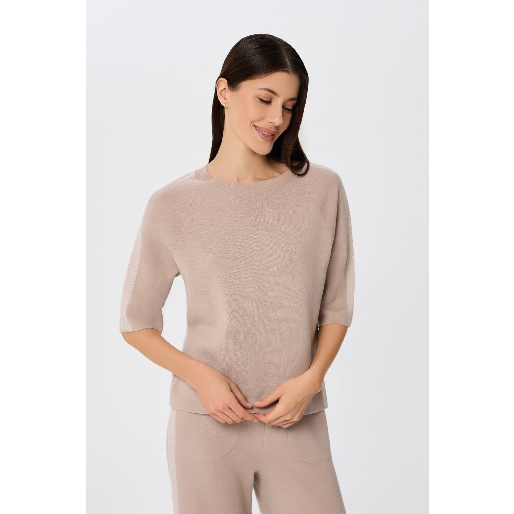 Kašmírový svetr s kulatým výstřihem a polodlouhými rukávy. Rukávy a boky mají bílý kontrastní vzor, který vytváří opticky zeštíhlující efekt. Luxusní odstín a specifický střih z něj činí stylový a praktický kousek pro každodenní nošení. ETERNAL WAVES — kolekce věnovaná nadčasové eleganci.