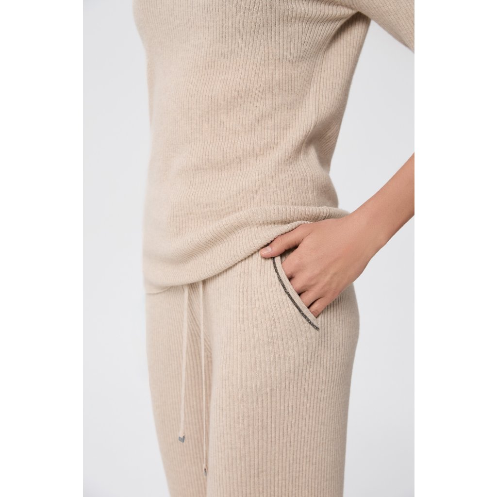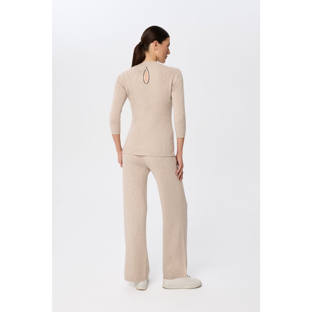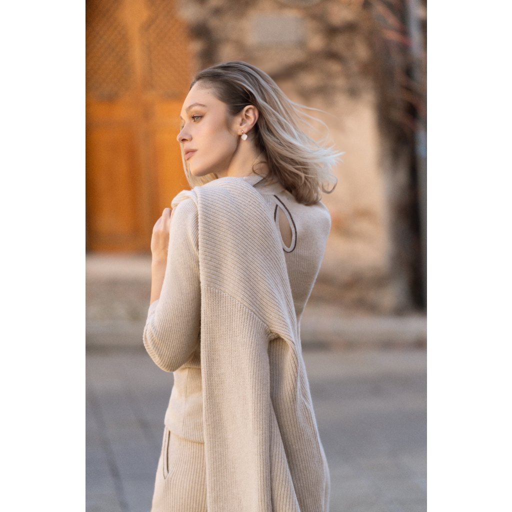 Elegantní kašmírový svetr se stojáčkem z žebrovaného úpletu – ztělesnění vytříbeného stylu a pohodlí. Přiléhavá silueta jemně zdůrazňuje postavu a jemně obepíná tělo, zatímco délka k bokům umožňuje všestranné stylingové provedení. Elegantní stojáček působí sofistikovaně a poskytuje teplo, zatímco zkrácené ¾ rukávy dodávají siluetě ženskost a vzdušnost. Hlavním prvkem kousku je tvarovaný zadní výstřih, ručně zdobený nádherným kovovým řetízkem z monilové vlny. Tento jedinečný detail poutá pozornost a dodává vzhledu jemný nádech tajemna. Luxusní perlově béžová barva podtrhuje ženskost a jemnost. Harmonie každodenního pohodlí a jemné ženskosti v kolekci QUITE MOTION.
