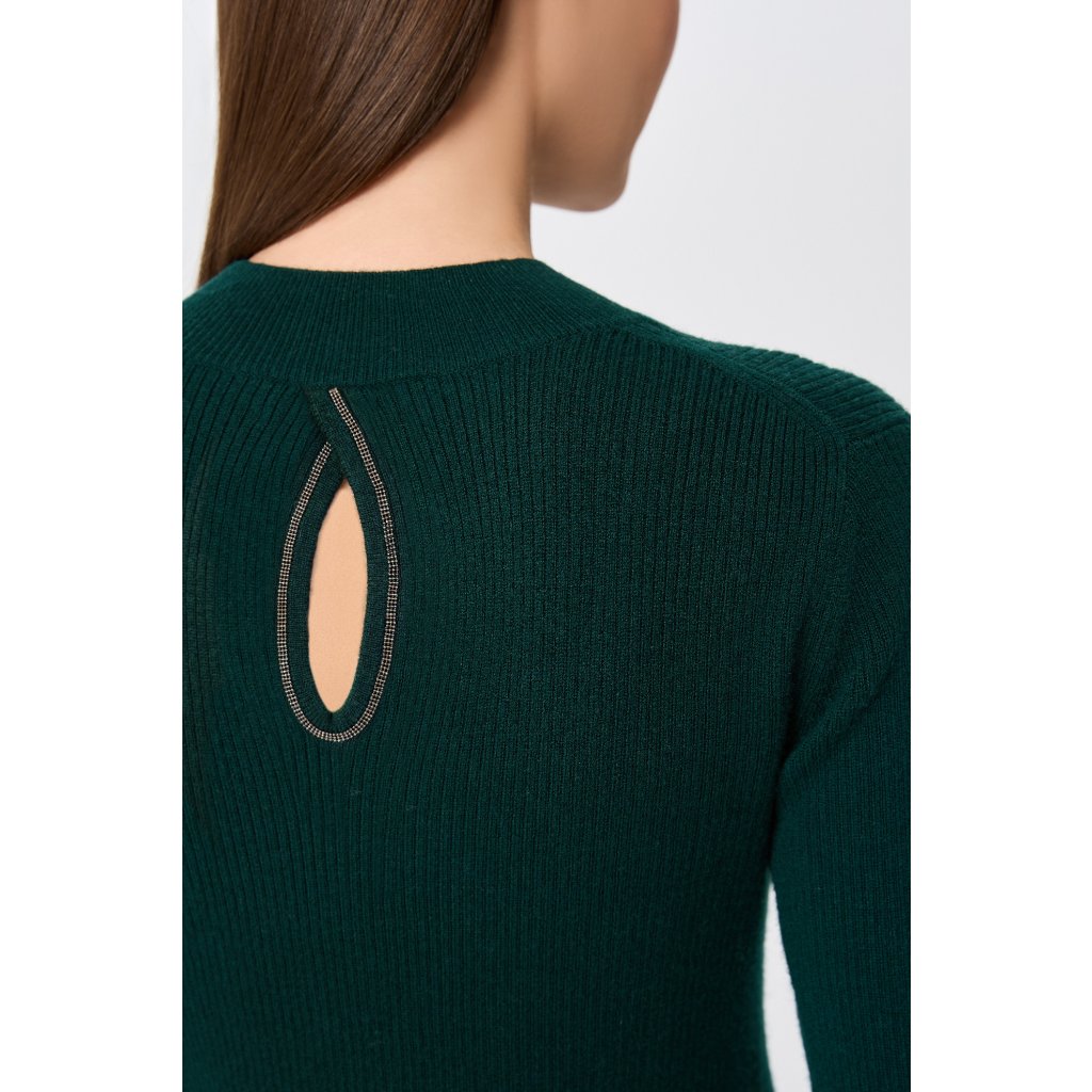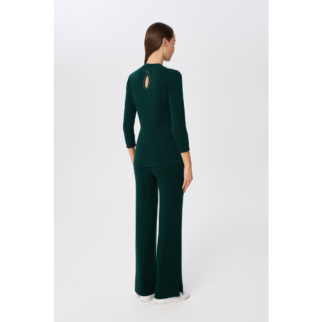 Elegantní kašmírový svetr se stojáčkem z žebrovaného úpletu – ztělesnění vytříbeného stylu a pohodlí. Přiléhavá silueta jemně zdůrazňuje postavu a jemně obepíná tělo, zatímco délka k bokům umožňuje všestranné stylingové provedení. Elegantní stojáček působí sofistikovaně a poskytuje teplo, zatímco zkrácené ¾ rukávy dodávají siluetě ženskost a vzdušnost. Hlavním prvkem kousku je tvarovaný zadní výstřih, ručně zdobený nádherným kovovým řetízkem z monilové vlny. Tento jedinečný detail poutá pozornost a dodává vzhledu jemný nádech tajemna. Luxusní smaragdový odstín evokuje lesní přírodu a vnitřní harmonii. Harmonie každodenního pohodlí a jemné ženskosti v kolekci QUITE MOTION.